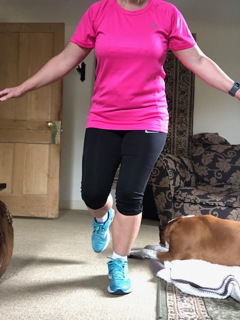 I’ve been doing my exercises religiously too (see below). The first picture is just a movement out to the side, pushing against the band to strengthen my hip muscles and the second is single leg squats to help my knees and ankles. (I thought I was doing pretty well but the dog doesn’t look overly impressed…)